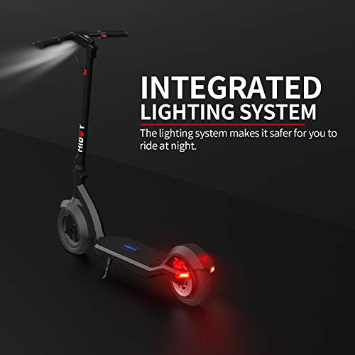 - Comfortable and safe riding: Equipped with a wider deck and 10-inch fat pneumatic tires ensure max comfort, even on speed bumps or rough surfaces. The headlight and brake light make you see and be seen at night. The dual mechanical disc braking and e-braking system ensure braking safety.