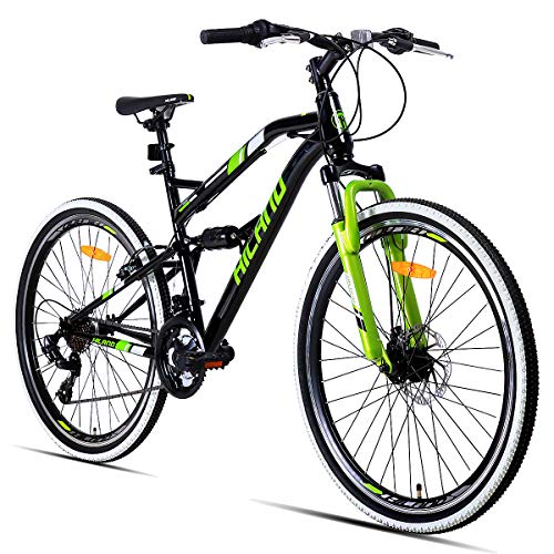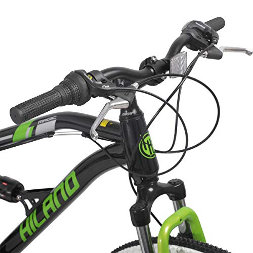 Details: Technical data: Valve:Schrader Valve (A.V),easy to inflating tires with a normal pump Frame:Hiland Steel Frame Fork:ZOOM Suspension Fork Shifters:SHIMANO RevoShift 21S Derailleur:Shimano Tourney Chain wheel: 24*34*42T Crank arm: length 170 mm Cassette:Shimano 14-28T Chain:KMC Z7 Tyres: Kenda 24/26*1.95 Tubes: Kenda 26*1.95,Schrader valve Rims: Aluminium double wall H 29 mm Seat post: 27.2 mm x 300 mm Pedals: 9/16 inch axle Delivery condition: 85 % pre-assembled Box contents: 1 bicycle with accessories (reflectors, pedals,tools,user manual)