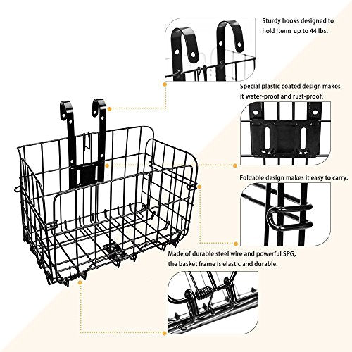 Details: While it¡¯s on your bike, it¡¯s securely fastened, stowing away your various possessions safely. But when you arrive at your intended destination, easily lift off the bike basket and take it everywhere you go. Folding Size:12.99*11.8*1.97 inches Package Weight:3.85 LBS Package Content: 1 x Bicycle rear rack basket 2 x Screws and nuts 2 x Rubber sleeve for 2 hooks. Carrying Weight:88LBS