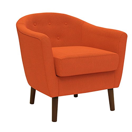- Orange fabric upholstered barrel chair creates a Retro look
