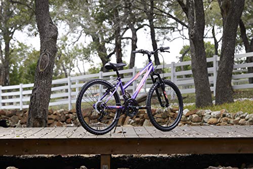 Details: Only from Huffy! The Huffy Stone Mountain is equipped to deliver in looks and in performance. The striking look in purple gloss, the 21 speeds, and the front suspension all add up to one hardtail ready for action. Backed by our limited lifetime warranty, (see owner's manual for details), the steel hardtail frame provides solid performance and efficiently transfers your pedal power for strong acceleration on straight surfaces and uphill climbs. Just follow the simple step-by-step instructions; our product manual guides you through every step. This 24-inch model is ideal for ages 12-19 and a rider height of 58-70 inches; an alloy quick release enables easy seat height adjustments. The ATB saddle, with premium padding, has stitched sides for lasting comfort. Front suspension on the Stone Mountain handles uneven terrain with ease. The suspension fork, in rich black gloss, absorbs any bumps and dips encountered on your path for a smoother-feeling ride. The indexed SHIMANO TZ-31 rear derailleur combines with the micro-shift twist shifter to deliver 21 speeds on-demand for uphill climbing, downhill riding, or pure acceleration. The removable rear derailleur guard protects the gears from any unintentional damage. Knobby 24" X 1.95" tires provide good traction in wet and dry conditions - on dirt, gravel, or even pavement. Lightweight alloy wheels in matte black blend well with the overall design. Front and rear steel linear pull handbrakes provide consistent, dependable stopping action on demand. The slight-rise handlebar enables upright riding to minimize back and shoulder strain. Kraton grips remain comfortable to the touch on short and longer rides.