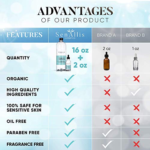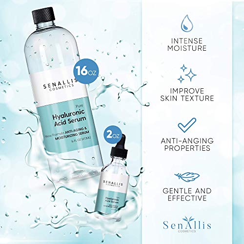 Details: Hyaluronic Acid (HA) helps to reduce wrinkles and other signs of aging, and did you know that it can hold up to *500x its weight in water?* It's acts as a great humectant when a moisturizer is applied over it. We are the direct manufacturer of our product and quality means everything to us, that's why they're made right here in the United States. Keep your skin looking youthful with our Hylauronic Acid serum pack, it comes with a 2 FL oz dropper bottle and a large 16 FL oz refill bottle. Keeping your skin moisturized is an important part and crucial element when using a Hyaluronic Acid serum, the HA pulls moisture from the air, and during the colder months the air will want to pull moisture from wetter objects, such as your skin, much like opening the window during a cool day will lower your homes temperature, make sure to add a moisturizer on top of this product once you apply it and it begins to dry. Helps to hide signs of aging such as, wrinkles, large pores, dark spots and slight imperfections on your skin. -30 days refund -No FRAGRANCES, PTHALATES, PARABENS