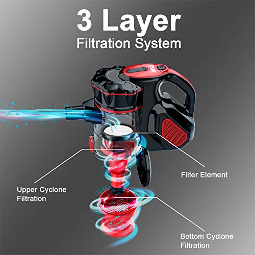 - Three-Layer Filtration System:The filtration system of this corded vacuum cleaner consists of the mesh filter on the top, the upper cyclone filtration, and the bottom cyclone filtration. The high-efficiency filtration system can effectively intercept and separate different sizes of dust and debris, also can speed up the airflow to prevent the motor from being blocked by dust, which extends the life of your vacuum cleaner.