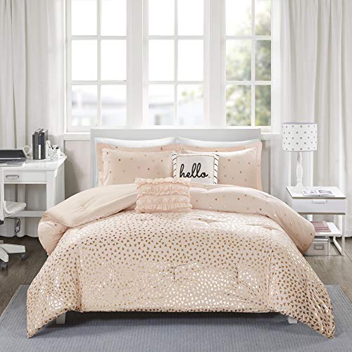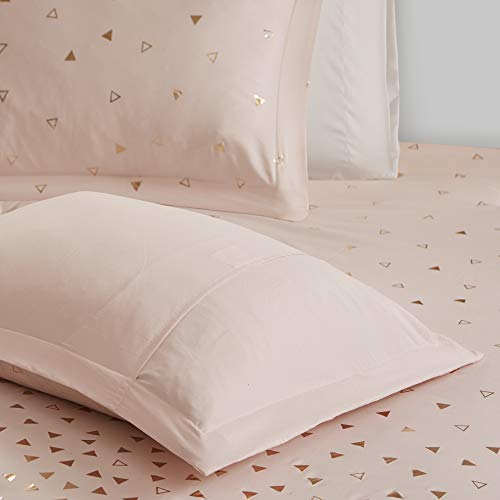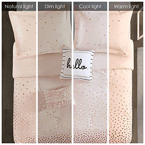 Details: Add some shimmer and shine to your bedroom with Intelligent Design’s Zoey Metallic Triangle Print Comforter Set. Made from ultra-soft microfiber, the blush comforter and 2 matching shams (1 in Twin/TwinXL) flaunt an ombre rose gold triangle pattern for a striking touch of glam. A solid blush reverse complements the top of the bed, while 2 decorative pillows provide the finishing touches to this bedding set. The square pillow features the word “hello” embroidered on the face and the oblong pillow uses fabric manipulation for added dimension and texture. Machine washable with hypoallergenic filling, this metallic comforter set provides a fun and flashy update to your bedroom décor.