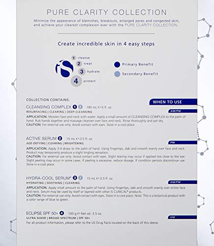Details: Product Description Minimize the appearance of blemishes, breakouts, enlarged pores and congested skin, and achieve your clearest complexion ever with the PURE CLARITY COLLECTION. Collection Contains: CLEANSING COMPLEX 180 mL ℮ 6 fl. oz. ACTIVE SERUM 15 mL ℮ 0.5 fl. oz. HYDRA-COOL SERUM 15 mL ℮ 0.5 fl. oz. ECLIPSE SPF 50+ 100 g ℮ 3.5 oz. Brand Story is CLINICAL is an industry leader dedicated to staying at the front of cosmeceutical technology by combining traditional, pharmaceutical grade, botanical ingredients with advanced scientific formulations.