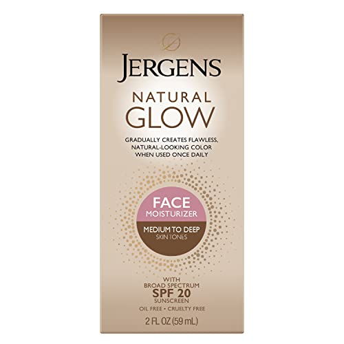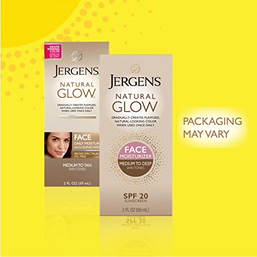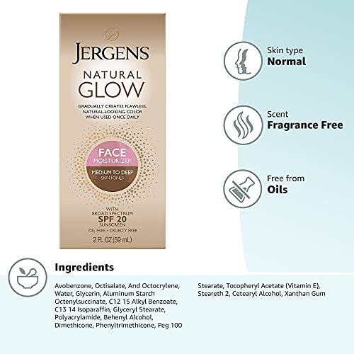 Details: A safe, natural-looking glow without the sun is possible with Jergens Natural Glow Oil-Free Daily Moisturizer for Face with Broad Spectrum SPF 20. This lightweight, oil-free moisturizer that is specially formulated for the face is infused with color-enhancing ingredients, nourishing emollients, and broad spectrum sunscreen. It delivers flawless, natural-looking color to the skin while keeping it hydrated and helping to protect against exposure to the sun. Applying at least once per day will enhance your natural skin tone within several days, and you'll have a beautiful, natural-looking glow in about one week. Use it in the morning under makeup, or at night before going to bed. Recommended by the Skin Cancer Foundation, Kao USA Jergens Natural Oil-Free Daily Moisturizer for Face with Broad Spectrum SPF 20 protects against both UVA and UVB rays. Satisfaction Guaranteed. Limitations may apply.