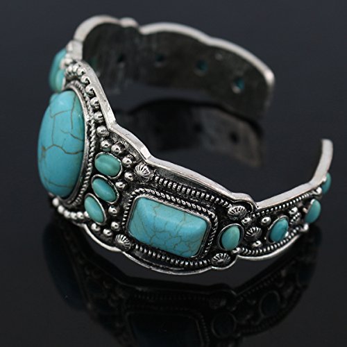 Details: Bundle: Bracelet & storage pouch. Great accessory for everyday wear. Gorgeous faux turquoise accented silver-tone cuff bracelets. Chunky open slip on style. Perfect gift for all occasions. Beautiful antiqued look. Heavy Weight. Hammered design cuff. Comes with protective ARIS storage bag