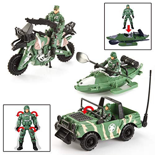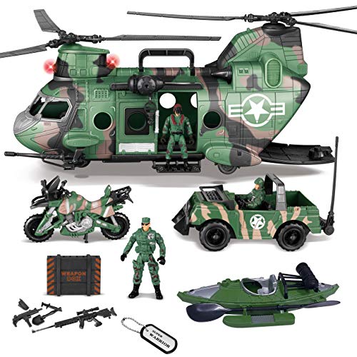 - SUPER VALUE PACK. Our pretend-n-play helicopter toy set includes 1 jumbo transport helicopter, 1 military truck, 1 kayak boat, 1 military motorcycle, 3 army men action figures, 1 weapon box, 1 name tag and various equipment figures.
