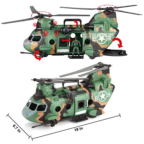 - REAL FUNCTION. It's both a great pretend-n-play toy and a convenient carrying case. Transport Helicopter can truly load other smaller military vehicles and men figures. Transport Helicopter has Realistic light & sound and many movable parts. Every man figure can fit in every vehicle, it can hold weapons and make various poses.