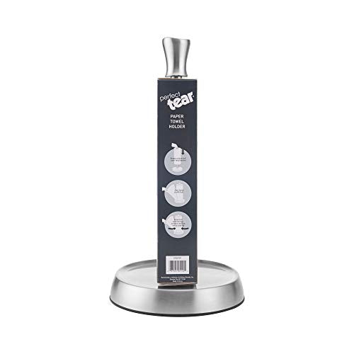 Details: The Kamenstein Perfect Tear Paper Towel Holder was designed for a true one handed tear, every single time never worrying about tearing off a entire roll of paper towels for an emergency clean up. The holder's patented 'Perfect Tear Technology' features an ingenious ratchet system that prevents rolls from unraveling and allows you to effortlessly tear one piece at a time, single handedly. The ratchet creates a slight resistance, making it easier to pull and tear. Featuring a weighted, no skid base, this aids in allowing you to enjoy simple, one handed operation. The interior wire roller is made from durable aluminum which is flexible and designed to fit regular rolls, standard rolls, select a size rolls, and even jumbo sized rolls. Crafted from brushed Stainless Steel, the Perfect Tear Paper Towel Holder is a modern addition to any kitchen. Paper towel rolls will simply slide on and off the roller, without having to remove the finial. This standing Perfect Tear Paper Towel Holder is perfect for your kitchen, bathroom, garage, laundry room, play room, workshop, craft room and is a space saving option for your rv, camper and motor home!
