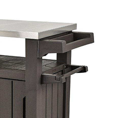 Details: Entertain this summer in style! When patio dining storage needs to look good and function well, the Keter Unity Extra-Large Entertainment Storage Table / Prep Station provides all that you need. Perfect for both indoors and out, this storage cabinet offers efficient mobility as it glides from the kitchen to the deck with ease. Its brilliantly designed structure provides numerous options for use, such as a mobile kitchen island, an attractive deck box alternative, or an extra surface for serving drinks and meal preparation on the patio. Keter truly delivers with this outdoor storage table / grill cart / prep station that allows you to serve your family and friends, while spending quality time with them as well. Zero Maintenance, Fade Free.