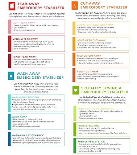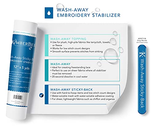Details: Wash-Away Sticky-Back StabilizerUse Wash-Away when there is a need for stabilizer to be completely removed, such as with freestanding lace and cutwork. Choose Wash-Away Sticky-Back for hard-to-hoop items and low stitch count designs. Kimberbell Wash-Away stabilizers are ideal for sheer fabrics and dissolve quickly in cool water.Water soluble mesh with water soluble adhesive coatingFor sheer lightweight fabrics such as chiffon, organzaUse with low stich count designs & hard to hoop itemsAdd a variety of Kimberbellishments for sparkle and shine. Experience the joy of creativity! At Kimberbell, our passion is helping people feel the joy of creativity by providing superior sewing, quilting and machine embroidery experiences. We have carefully curated a wide selection of quilting and sewing designs and we provide easy to follow step-by-step instructions so you can get the most out of your project.