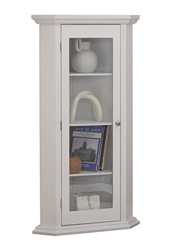 Details: Kings Brand Furniture - Corner Curio Storage Cabinet with Glass Door, White Finish Product DescriptionMake the most of your empty corners with this Display Curio Cabinet giving storage and display with modern style.4 interior shelves sit behind an easy-to-open clear glass door, showcasing your items, with a metal handle that gives added style. FeaturesProduct Type: Accent cabinetFinish: WhiteMaterial: WoodDoors: GlassNumber of Cabinets: 1Number of Interior Shelves: 4Assembly: Required DimensionsOverall Dimensions: 22.5"W x 15"D x 42"HCorner Size: 16" x 16"Overall Inner Cabinet Size: 11"W x 10"D x 39"HHeight Between the Shelves: 9.5"