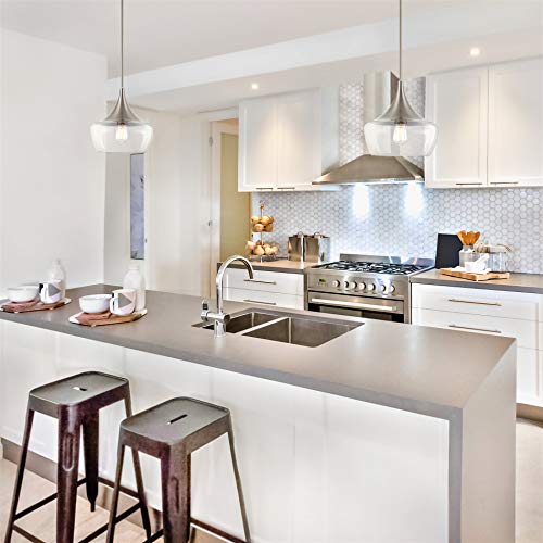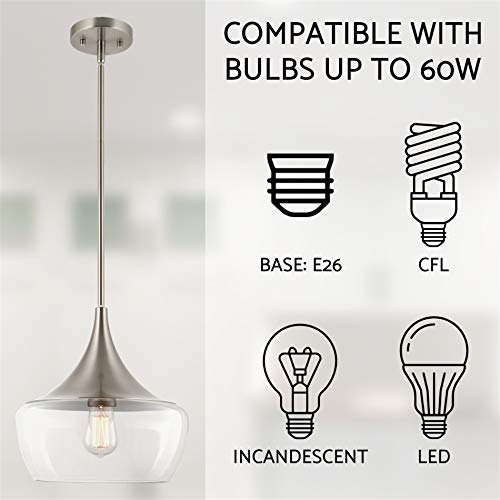 - TRANSITIONAL DESIGN: Pendant light features a vintage, yet fresh schoolhouse style, creating the ideal ceiling light. Paired with a graceful tapered wine glass shade and brushed nickel finish, this decorative light fixture provides a warm ambiance & glow