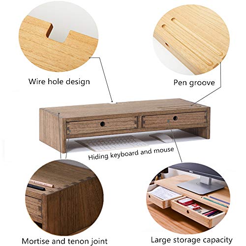 Details: Wood Desk Monitor Stand with 2 Drawers DBR This wood monitor stand is full finished which bring you a neat desktop at home/ office/ living room/ bedroom, perfect for using as a desktop stand, TV printer stand, laptop stand, or a computer stand. Featuring 2 large drawers, this stable monitor stand is ideal for cutting clutter on your desktop, counter, or any other surface in your home or office, increase space for computer accessories as desk storage shelf with drawer organizers. The computer riser elevate screen up to eye level for comfortable,let you get free from tension headaches or eye and neck strain. With the exquisitely polished and smooth surface, the flat edges,mortise and tenon joint, and odorless properties, this wooden monitor riser offers you a stylish and durable computer monitor arm riser without any air pollution. Features: Fully assembled; Mortise and tenon joint; Selected wood; Scientific design & Suitable Size; Large storage space; Exquisite workmanship; Handcrafts; Plant oil dye, harmless& eco-friendly. [Product Quality] Kirigen is one factory specialized in producing solid wood furniture and home decor about 30 years. Each product has been strictly qualified before shipping. Both the design and quality of our products are praised by our international customers. [Our Service] If you have any questions about the desk organizer riser, pls don't hesitate to contact with us by sending us massage directly on Amazon, we will respond within 24 hours. Thanks. For a touch of fresh style that will bring charm and utility to any space, this lovely wooden desktop organizer stand is the perfect choice.