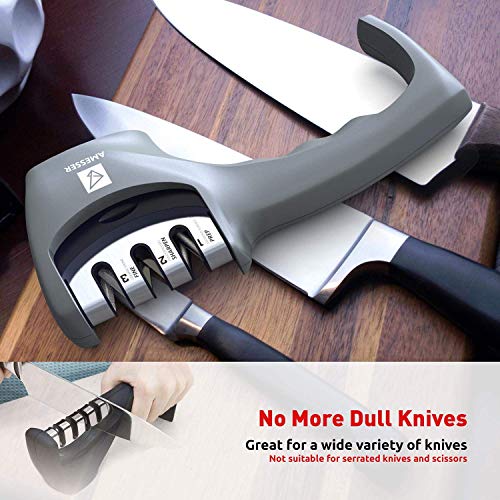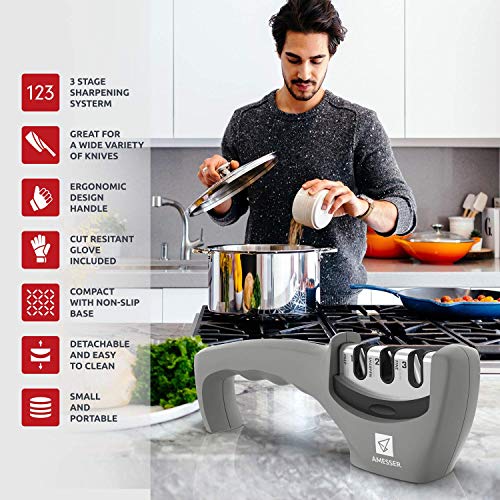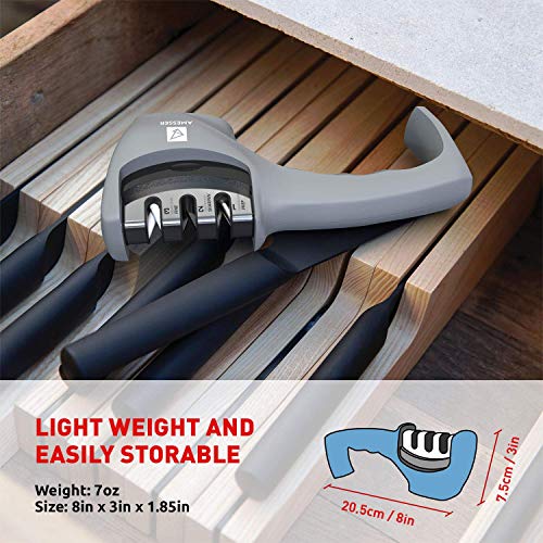 - A Complete 3-Stage Sharpening Device: 🔪 With diamond, tungsten steel, and ceramic rods for fixing, coarse sharpening, and honing, the Amesser Kitchen Sharpener will take care of your blades in every way. This compact but mighty device eliminates the need to have several stones and honing rods in your kitchen, saving space in your countertop.
