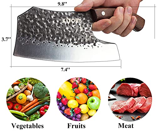 Details: KITORY Vegetable Cleaver 7.4" Effort Saving Forged Kitchen Knife Handmade Chef Knife Butcher Physics Design High Carbon Steel Ash Wood Ergonomic Handle ăParameteră Full Length: 9.8" Blade Length: 7.4" Weight: 0.65 LBS Blade Material: High carbon 7Cr17MoV stainless steel Handle Material: Ash wood(Dark Brown) KITORY pursues high industry quality and surpasses industry standards. Well-made tools are essential for cooking delicious meals and that is our belief for lifetime. We offer exceptional knives that far exceed the value of traditional brands. We hope that our customers build a life-long love affair with the products we bring to the table. ăFeaturesă Precision forged, ultra-sharp, wear resistant, high carbon 7Cr17MoV stainless steel. Effortless vegetable cleaver, you won't feel tired after using for a long time. Exquisite hammered dimples on the blade's surface, which can reduces drag and minimizes stuck on food. Ash wood handle, tasteful appearance, features high hardness and anti-corrosion, a light fragrance and remains for a decades. Full-tang ergonomic handle for durable and comfortable hand grip. Cleans easily. Small Tips for Using This Knife 1. Do not cut bones or frozen food. 2. Do not cut food on hard objects. (glass, ceramics, metal board, stone plate etc). 3. Due to this knife has higher carbon content, please pay attention to clean the knife, and acidic or alkaline substances cannot stay on the blade for a long period, it is not suitable for dishwasher. Such knife shall be washed by hand, then keep it air dry or wipe it by cloth. 4. Please store it in a safe place where your kids cannot get it. 5. Please do not touch the knife edge by hand directly. 6. Please note all dimensons are measured manully, the devistion is within 1-2 mm.