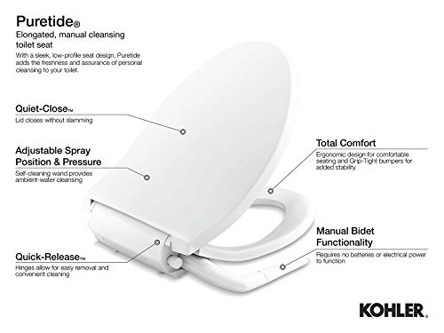 Details: The pure tide cleansing toilet seat makes it easy to add the freshness and assurance of personal cleansing to your existing toilet. With a sleek, low profile seat design, pure tide provides the superior cleansing of a spray wand that's fully adjustable for position and water pressure. This manual cleansing seat requires no electricity or batteries and installs in minutes, connecting to the toilet's water supply line. Kohler bidet seats overview sleek and smart, a cleansing seat will elevate your daily routine. It’s an instant upgrade to any toilet with customizable amenities you might experience at a spa or in a luxury hotel, including warm water cleansing, heated toilet seat, nightlight and much more. Kohler bidet seats are designed to fit most toilets and our signature designs complement a range of decors. Smart toilets and bidet seats feature water cleansing as a refreshing alternative to toilet tissue alone. They give you complete control over the entire experience with intuitive controls. And they will leave you feeling confident, assured and cleaner than clean. Seat-mounting holes: 5-1/2 inches.