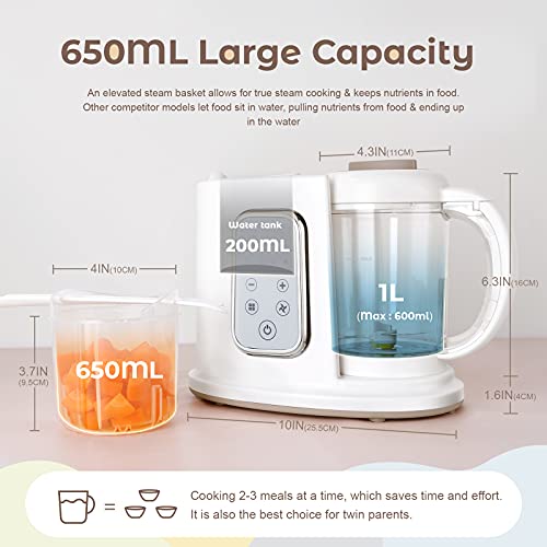 - ❥【Large Capacity】Our baby food processor is equipped with a large 200ml water tank, which can hold a 3-inch milk bottle. Steaming basket: 650ml, cooking 2-3 meals at a time is completely fine, it is also the best choice for twin parents.