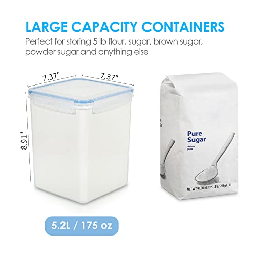 - Perfect for Storing Dry Food ---- The size of each container is 7.5 x 7.5 x 9.1 inch ( 5.2L / 176 oz) , with the large capacity, these kitchen storage containers are perfect for many kinds of dry food and baking supplies, such as flour, sugar, rice, grain, chips, cereals, nuts, beans, snacks, pasta, coffee and tea. Plus wide enough openings to reach in with measuring cup.