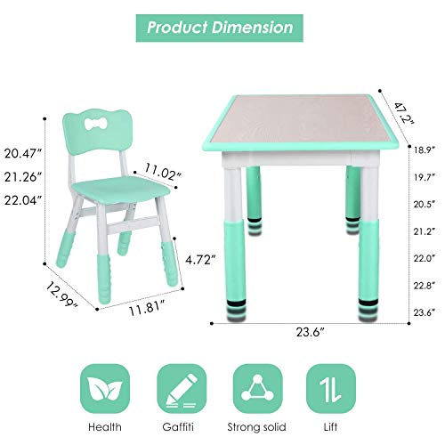 - HEIGHT ADJUSTABLE DESK & SEAT: There are 5 levels for table to adjust from 18.9”-23.6”, 3 level for chairs to adjust from 20.8”-22.4”, with 19”*47” tabletop size, suits boys and girls of 2 years-10 years old, 1" adjustable table pad solve the problem of uneven ground effectively; inclined legs prevent children from flipping while playing games.