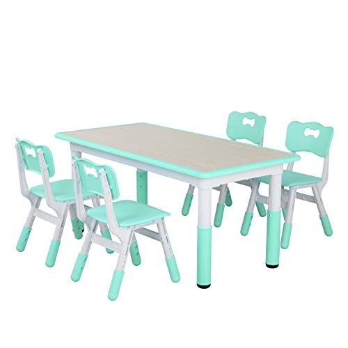 Details: About LAZY BUDDY With more attention than ever on improving well-being, children’s needs are on the agenda. LAZY BUDDY provide every one of our customers with the most innovative, relaxing, healthy and kids care products. We're committed to creating useful products backed by friendly, responsive service to delight our loyal customers around the world. Product Feature: 1.Ergonomic Design Unique recesses design on backrest and seat plate makes the kids table and chairs set perfectly fit for different children. 2.Adjustable Desk & Seats 5 levels 18.9”-23.6” height adjustable Table, 3 level 20.8”-22.4” height adjustable chairs fit for various kids. 3.Painting Board Teach children to practice painting on the desktop then wipe the pattern by wet rag. 4.Anti-slip With sunflower pattern on the surface, which is stable and interesting. 5.Security Assurance Certified by CPC certification, safe and environmentally friendly. 6.Weight Capacity Table: 330lbs, Chair: 220lbs 7.Special Usage: Dinning , write homework, do arts and crafts, play board games, have fun Specifications Color:Blue and Gray. Material: High quality plastic Product Weight: 49 LBS Table Size: 47”(L)*19”(W)*19”/24”(H) Chair Size: 14.9”(L)*11.8”(W)*20.8”/22.4”(H) Package Contents -1*Table Set -4*Kids Chairs 24-Month Warranty