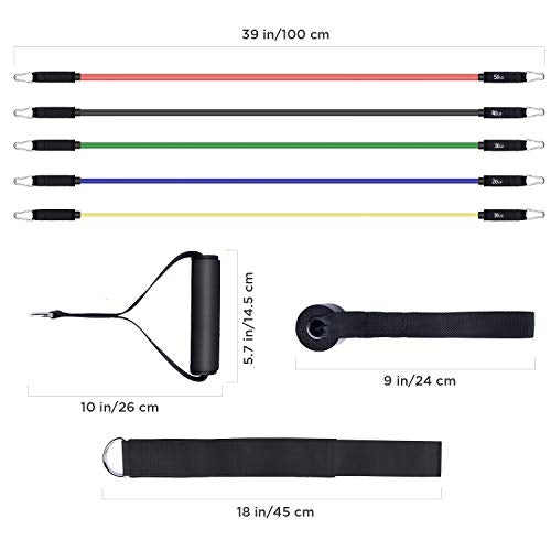 - What's Included: 5 durable latex bands, 2 cushioned handles, 2 ankle straps, 1 carrying bag, and 1 exercise guide.