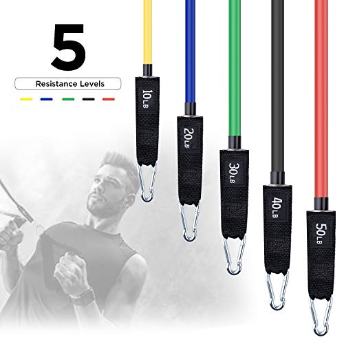- 5 Color Exercise Bands: All exercise bands are 41" in length and come in yellow (10 lbs), blue (20 lbs), green (30 lbs), black (40 lbs), and red (50 lbs). Our workout bands can be used independently or in different combinations, with a maximum resistance