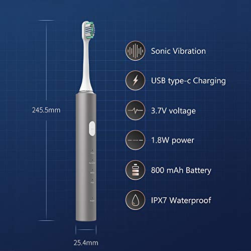 Details: Feature: - The first aluminum magnesium alloy electric toothbrush,Anti-falling, anti-mold, anti-oxidation, anti-scratch. - Metal-free design makes the brush head rust-free, environmentally friendly and healthy. Selected the United States DuPont selected high-quality soft bristles (0.152mm) , each bristles are treated by sanding, to avoid the hair hart worn gums, scratch The teeth surface. - Built-in smart chip , 30 seconds transposition reminder function , 2 minutes timer reminder function, gear memory function . Enjoy the most scientific and healthy Teeth and Oral care. - More than 31,000 beats per minute vibration, more efficient delivery to the brush, scour tooth gap, clean plaque. - Four brushing patterns, "Clean", "Sensitive", "Whiten", "Polish", Solve various oral problem, USB Type-C Charging, full of electricity can be used for 45 days. Specification: Material: Aluminum-magnesium alloy Waterproof grade: IPX7 Vibration frequency: >31000 times / minute Charging power: 2W ± 0.25W Charging current: 80mA ± 20mA Working voltage: 3.2V~4.2V Working current: 100ma~450ma Power consumption: 1W ± 0.7W Charging time: 3 hours Battery capacity: 800mAh Indicator light: LED indication Package included: 1* Electric toothbrush body 2* Toothbrush head 1* Charging Cable 1* Instruction manual