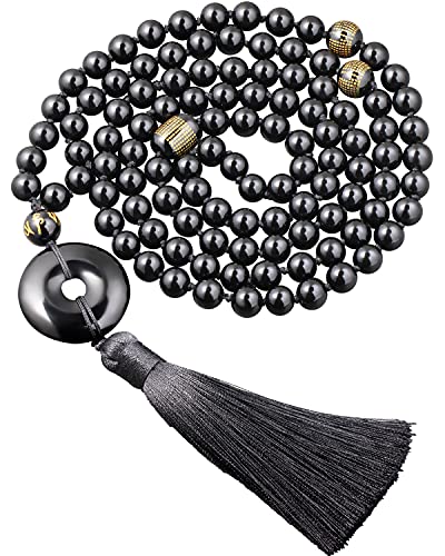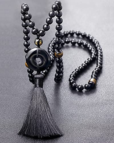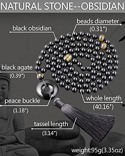 - ❤Material&Size: Black agate, black obsidian,beads size:8mm(0.31"), Sutras beads size 10mm (0.39"), whole length:102cm(40.16"), peace buckle diameter: 30mm(1.18" ),thickness:7mm(0.28"), Tassel length: 8cm(3.14"),whole weight: 95g(3.35oz);