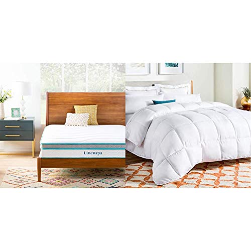 Details: Linenspa 10 Inch Memory Foam and Innerspring Hybrid Mattress - Medium Feel - Queen Not too soft and not too firm, this mattress falls right into the sweet spot of perfectly comfortable for sleepers of all styles and preferences. A thick layer of memory foam is quilted into the cozy knit cover to provide a cocoon of comfort that will lull you to sleep. Memory foam conforms to your body to align the spine for comfort that leaves you rested and pain-free. Under another couple layers of foam, a base made up of 6 inches of high-quality springs provides the support you need. Order this medium-feel mattress and it will be shipped right to your door. Mattress comes compressed and rolled in a box for hassle-free delivery and setup; all you have to do is unroll it and enjoy the comfort of the LINENSPA 10 Inch Memory Foam Hybrid Mattress. Linenspa All-Season White Down Alternative Quilted Comforter - Corner Duvet Tabs - Hypoallergenic - Plush Microfiber Fill - Machine Washable - Duvet Insert or Stand-Alone Comforter - Queen Get year round comfort without allergens. The Linenspa down alternative comforter features ultra soft fabric and 300 Gsm microfiber fill for the right amount of warmth and softness, but none of the allergy symptoms associated with goose down. Quilted to keep fill in place, this comforter has eight convenient corner and side loops to hold a duvet cover in place. Plus, your bedding will always be stylish thanks to the reversible solid and striped options. It is machine washable and dryer safe.