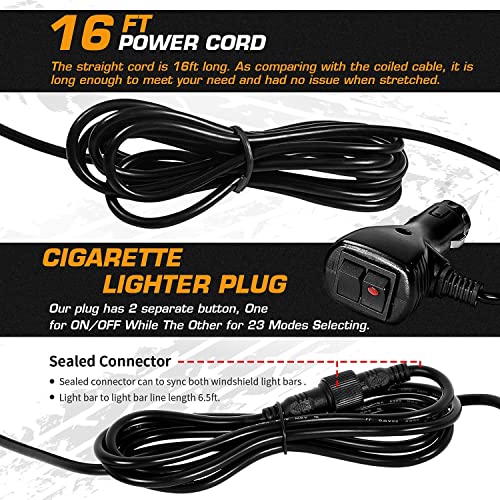 - SYNCHRONIZED FLASH PATTERNS: This split led dash light include a double switch with fuse which can easy plug in any 12v cigarette adapter, the double switch is an ON/OFF power switch and 2nd switch to change between 23 Flash Patterns synchronized ( including pulsing, alternating patterns), Memorizes last pattern used (recall last pattern).