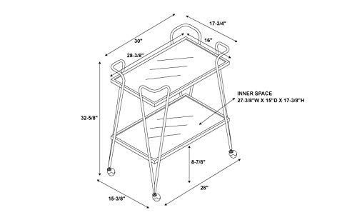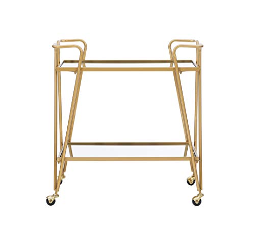 Details: Mid Century design meets versatile utility and storage with this Gina bar cart. The spacious mirrored top and bottom shelf provide ample room for bottles, glasses and other bar necessities. Durable castors make for easy mobility around your space. Finished in gold, the piece is stylish and unique.