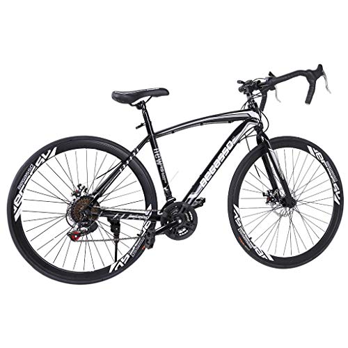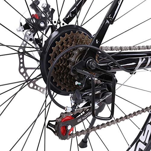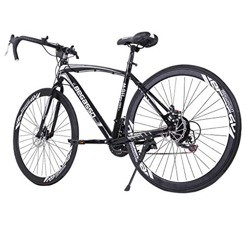 Details: Features: 3 spoke aluminum wheels: lightweight and more durable Gift for friend Disc Brakes Fashionable, advanced Suspension, Shimanos Derailleur, SHimanos 30 Shifter Disc brakes-Mechanical,Fast delivery High quality, Full suspensio Mens/womens bikes Accessories introduction: F/derailleur: Shimanos TZ-30 R/derailleur: Shimanos TZ-50 Shifter: Shimanos 30 Freewheel: 7 tower wheels Chain: 108 chain Chainwheel: 170 three small sprocket Frame/Fork: One-piece front fork Handlebar/stem: one bend Tire: 700c Frame: high carbon steel Brake: mechanical disc brake Product description: Tire size: 26in Product size: 150x25x(59-70)cm/59x9.8x(23-27.5)in Product packaging size: 134x72x19cm/52x28x7.5in Gross weight: 18kg Products include: 1x bicycle Note: It is an affordable entry level 21 speed road bike well suited for commuting. It features a lightweight aluminum frame , a Shimanos drivetrain powerful disc brakes for all weather stopping. The complete bike weighs in at an impressive 35 lbs, the lightest in its class. Free pedals are included with every bike!