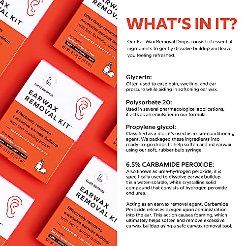 - Fast-acting foaming ear wax removal solution leaves you feeling refreshed: Made with 6.5% urea hydrogen peroxide (also known as carbamide peroxide), our water-soluble ear wax drops will dissolve buildup by foaming and softening ear wax upon contact for quick and easy removal.