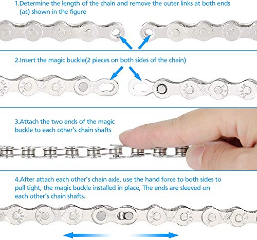 - 🚴Package includes: stainless steel chain hook + all steel chain cutter + professional version of steel needle + rocker + prop rod + head + chain + bicycle chain magic buckle