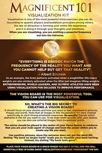 Details: Create a Vision Board that displays your personal success vision. Place it in a space where you see it often and you will end up doing visualization exercises every day. This is a proven practical tool to immediately start using the law of attraction in your favor. Holds professional Vision Board supplies such as fill in the blank intention cards, gratitude cards, a blank check, a blank bank statement, life-goals pictures designed to generate emotions of having achieved these goals, and many supplies more!
