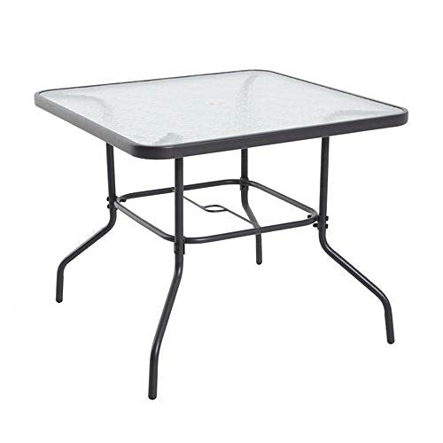 - Table: Water wave tempered glass top Pre-cut umbrella hole: 2" Powder-coated steel frame Dimensions: 33.8"L x 33.8"W x 27.5"H Product Weight: 28.22 lbs
