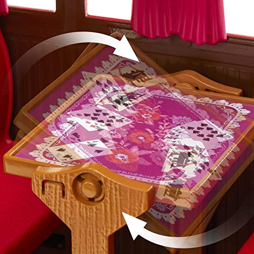 - Play out the travel fun with the adorable train that has four rolling wheels, a balcony, seating for four and a table that flips from tea time to game time!