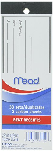 Details: 66 count, rent receipt book, 33 duplicate sets, 8.38" x 2.88", white & Canary special ruled paper with safety tint, original & carbon sheets are perforated, Yellow duplicate sheets are not perforated.