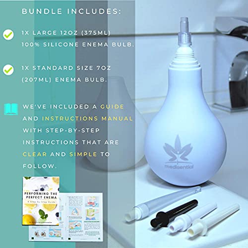 - ✅ 2 IN 1 ENEMA BULB BUNDLE - Medisential Enema Bulb Kit offers great value by offering 1 12oz (375mL) Large Enema Bulb & 1 7oz (220mL) Standard Enema Douche in one package. Both enema kits provided are non-toxic & can be used in the comfort of your home. Enema parts and enema nozzle tips included. Full instructions are provided.