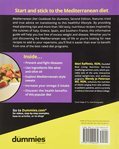 Details: Product Description Benefit from the Mediterranean diet For decades, doctors and nutritional experts have observed—and confirmed—that people in Mediterranean countries have much lower occurrences in vascular disease, obesity, cancer, and diabetes than their counterparts in northern European countries and the United States. Now, Mediterranean Diet Cookbook For Dummies shows you how to cook meals inspired by the cuisines of Italy, Greece, Spain, and southern France so you too can live a healthier life free of excess weight and disease. The Mediterranean diet—ranked #2 in Best Diets overall, it is high in vegetables, fruits, olive oil, and whole grains, and moderate in protein and animal fats—has proven to be beneficial in reducing the risk for diabetes, heart disease, and stroke. Now, a new study shows it may also be good for the brain. The Mediterranean diet isn't just a fad or a quick fix—it's a healthy lifestyle choice that's here to stay! Create more than 150 tasty recipes Get expert tips on meal planning and exercise regimes Prevent and fight diseases by eating delicious food Find delicious alternatives to unhealthy ingredients Whether you're just discovering the Mediterranean diet or are looking for some new recipes to add to your repertoire, this updated, hands-on guide offering the latest research has everything you need to start living a healthier life. From the Inside Flap Make more than 160 healthy and delicious recipes Lower your risk of heart disease, cancer, and diabetes Start living the Mediterranean lifestyle today Start and stick to the Mediterranean diet Mediterranean Diet Cookbook For Dummies, Second Edition, features tried and true advice on transitioning to this healthful lifestyle. By providing meal planning tips and more than 160 tasty, nutritious recipes inspired by the cuisines of Italy, Greece, Spain, and Southern France, this informative guide will help you live free of excess weight and disease. Whether you're just discovering the Mediterranean way of life or you're looking for new recipes to add to your repertoire, you'll find it easier than ever to benefit from one of the best rated diet programs. Inside… Prevent and fight diseases Use ingredients like wine and olive oil Explore Mediterranean-style sweets Increase your omega-3 intake Discover the health benefits of this popular diet From the Back Cover Make more than 160 healthy and delicious recipes Lower your risk of heart disease, cancer, and diabetes Start living the Mediterranean lifestyle today Start and stick to the Mediterranean diet Mediterranean Diet Cookbook For Dummies, Second Edition, features tried and true advice on transitioning to this healthful lifestyle. By providing meal planning tips and more than 160 tasty, nutritious recipes inspired by the cuisines of Italy, Greece, Spain, and Southern France, this informative guide will help you live free of excess weight and disease. Whether you're just discovering the Mediterranean way of life or you're looking for new recipes to add to your repertoire, you'll find it easier than ever to benefit from one of the best rated diet programs. Inside… Prevent and fight diseases Use ingredients like wine and olive oil Explore Mediterranean-style sweets Increase your omega-3 intake Discover the health benefits of this popular diet About the Author Meri Raffetto, RDN, founded Real Living Nutrition Services (reallivingnutrition.com), which pro- vides one of the only interactive online weight-loss and wellness programs. Wendy Jo Peterson MS, RDN, enhances the nutrition of clients ranging from elite athletes to pediatric patients, and is currently a culinary instructor at Mesa College.