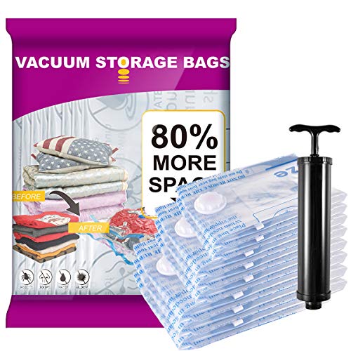 Details: Meiqihome Set of 8 heavy-duty vacuum compression storage bags, 3 different size provided, and Ideal for: 3 Units of Jumbo Bags (40" x 30") Duvet, Comforter, Blanket, Bed sheets, Pillows 3 Units of Large Bags (32" x 24") Clothes, Chunky sweaters, Thick towels, Items like down jackets and curtains 2 Units of Medium Bags (28" x 20") Clothes, Extra bed lines, Some towels ▶ 80% Space Saver Bags These simple bags can be easily loaded and sealed using a home vacuum cleaner to reduce larger and fluffier articles of clothing like vests and winter coats to their minimum possible size. Vacuum compression bags are also handy for comforters, blankets, duvets, towels, clothes, pillows, linens, plush toys, and more. Our space saver bags are an ideal solution for adding more storage space to your wardrobes, closets, garages, basements, lofts, and suitcases. ▶ Double Zip For long-term sealing solutions, double zip seal may be more in line with your expectations. No air will enter in the bags keeping them super compact and tight for a prolonged period. ▶ Triple Seal Valve Our space saver storage bags come with triple seal valve, provides air isolation for long term storage. There is a cap each valve to impact the rubber stopper. The Internal thread confirms that the cap is completely secure and tight. (NOTE: Do not remove the rubber stopper) ◆ NOTE: To ensure better sealing performance, please slide the zipper across the bag 2-3 times and use your hand to press the sealing line. After, vacuum out the air, then tighten the cap and make sure the rubber stopper is fitted. Package included: 3 x Jumbo Bags (40" x 30") 3 x Large Bags (32" x 24") 2 x Medium Bags (28" x 20") 1 x Hand pump