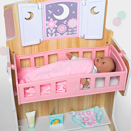 - Everything kids need to nurture and play with their dolls and stuffed animals: Wooden multi-functional doll and stuffed animal baby care center with kitchen, bathing and changing area, and nursery; feeding, diaper-changing, and bathing accessories
