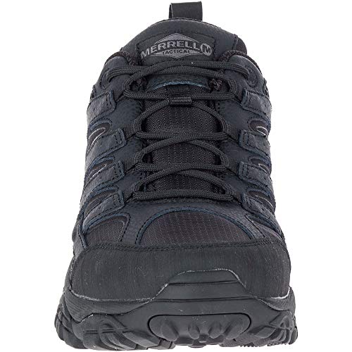 Details: MENS MOAB 2 TACTICAL SHOE DETAILS The same out-of-the box comfort you love from our original Moab hiking boot, re-invented for long days on duty. With a durable leather and ripstop upper and Vibram TC5+ outsole for durable traction, the Moab 2 Tactical shoe is built for the toughest environments. FEATURES TRUSTED TRACTION: Vibram TC5+ outsole delivers traction on any surface. DURABLE MATERIALS: Waterproof PU coated leather and ripstop uppers are built to stand up to the toughest jobs. TIME-TESTED FIT: Built on the original Moab platform - a favorite on the trail for comfort and durability since 2006. SPECS: Upper - Durable PU coated leather and ripstop textile. Stability arms with spray rubber for added security and durability. Closure - Bellows tongue is attached to upper on both sides to keep out debris. Toe - Protective, abrasion resistant rubber toe cap. Heel - Molded internal heel counter cups the heel for added stability. Lining - Breathable mesh. Footbed - KINETIC FIT footbed with added zonal arch support and heel cushioning. Midsole - Features Merrell air cushion in heel to absorb shock and add stability. Lightweight nylon arch shank gives flexible support where you need it. Outsole - Vibram TC5+ outsole for durable traction in any environment. Lug Depth - 5mm Weight - 2lb (908g) per pair