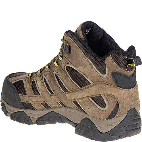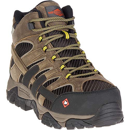 Details: The Merrell® Work Moab 2 Vent Mid Waterproof CT boot is the ideal choice for safety toe protection, slip resistance, and underfoot comfort that lasts even on the toughest jobs. Part of the Merrell Work Collection. Waterproof full grain leather and textile upper. Lace-up work boot with a lightweight, nonmetallic composite safety toe. M Select™ DRY waterproof membrane keeps feet protected from outside elements. Features external stability arms with spray rubber for added security and durability. Strobel waterproof construction. Bellows tongue helps keep debris out. Lace-up closure system with non-metallic hardware. Protective, abrasion-resistant rubber toe cap. Heel pull tab. Mid-height boot for added ankle protection. Breathable mesh lining offers a great in-shoe feel. KINETIC FIT™ blended EVA contoured footbed with zonal arch support and heel cushioning for daylong comfort. Air cushioning in the heel absorbs impacting shock and adds stability. Molded nylon arch shank supplies flexible support. Outsole is oil and slip resistant and is Mark II tested. M Select™ GRIP rubber outsole with 5mm lug depth offers excellent traction and grip on various surfaces. Heat-resistant outsole provides protection for brief periods of direct contact with temperatures that meet or exceed 500°F. Composite safety toe meets ASTM F2413-11 I/75 C/75 EH safety standards. Imported. Measurements: Weight: 1 lb 11 oz Shaft: 5 in Product measurements were taken using size 11, width M. Please note that measurements may vary by size. Weight of footwear is based on a single item, not a pair.