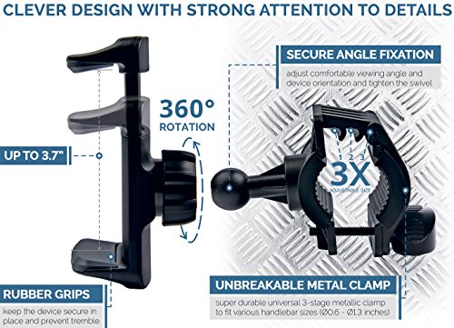 - EXTRA SECURE & SHOCK ABSORBING rubberized clip with silicone belt grips device firmly and securely. The band wraps around four corners of cellphone of any size even when in lifeproof case. This thing holds tight, make the most extreme ride - the phone will not fall! The metallic bar clamp is unbreakable!