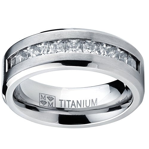 Details: This gorgeous and elegant silvertone Titanium engagement ring features a light satin brushing contrast at the center of the ring and high polish beveled edges. Nine large .10 carat AAA grade princess-cut Cubic Zirconia are delicately channel-set in this already gorgeous men's wedding band. Wear as a wedding band or an accessory to your everyday wardrobe. Exquisitely crafted of genuine solid Titanium. Comfort-fit band: contoured inner surface for a more comfortable fit with everyday use in mind. Hypoallergenic: will not cause skin irritations or turn your fingers green. Measures in width: 8 millimeters. Complimentary jewelry ring gift box