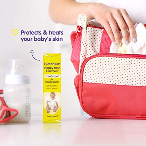 Details: Soothes and treats your baby's nappy rash. Metanium nappy rash ointment is a topical ointment which rubs easily into the skin to treat nappy rash. Metanium ointment is specifically formulated to soothe and effectively treat nappy rash. Even the most absorbent nappy leaves some moisture on a baby's delicate new skin. A baby left in a dirty nappy for too long may also develop nappy rash. Nappy rash can appear on the bottoms of babies with particularly sensitive skin even if the nappy is changed frequently. The most common cause of nappy rash is from micro-organisms in babys faeces coming into contact with urine to produce ammonia. This causes a change in the ph levels of the skin and the resulting irritation which can lead to nappy rash. A babys skin is nearly half as thin as that of adults and therefore more delicate and prone to damage. Metanium ointment is specifically formulated to soothe and effectively treat nappy rash. Metanium ointment is a protective ointment that can be used at every nappy change and especially at bedtime when your baby will not be changed for a while. Metanium ointment rubs easily into the skin and creates a barrier between babys delicate skin and the irritants in urine and faeces helping to treat and prevent nappy rash