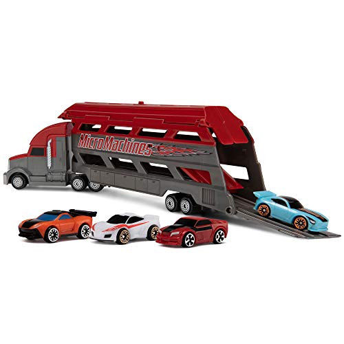 Details: Load ‘em up and haul ‘em out! Expand your play with the Micro Machines World with the mini-vehicle hauler! Featuring four toy car collectibles, you can take your Micro Machines vehicles on the road with this iconic vehicle hauler. Open the top of the trailer or lower the back ramp to load up to 8 Micro Machines cars into the Hauler. After that, it’s time to hit the road! Micro Machines Mini Vehicle Hauler delivers complete play out of the box and is perfect for car enthusiasts and toy car collectors of all ages. These haulers and all Micro Machines toys make an excellent gift for both kids and collectors alike with iconic identifiable themes and eye-catching details. Others sold separately, subject to availability. Colors and decorations may vary.